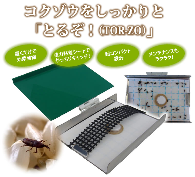 「TOR-ZO(トル・ゾ)」は、コクゾウムシを専用の誘虫剤で誘い、強力な粘着シートでコクゾウムシを逃しません。